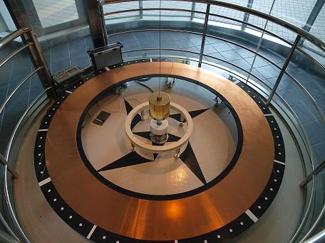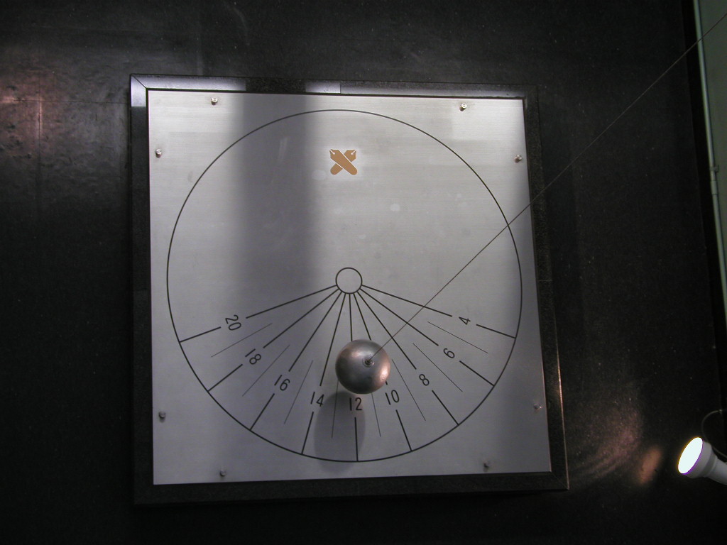 電磁石であらゆる緯度の振動回転を再現 ←(フーコー振り子といえるか?) 故障したので撤去した 回転を床面のブロック転倒で表示。ブロックは毎朝係員が立てる |