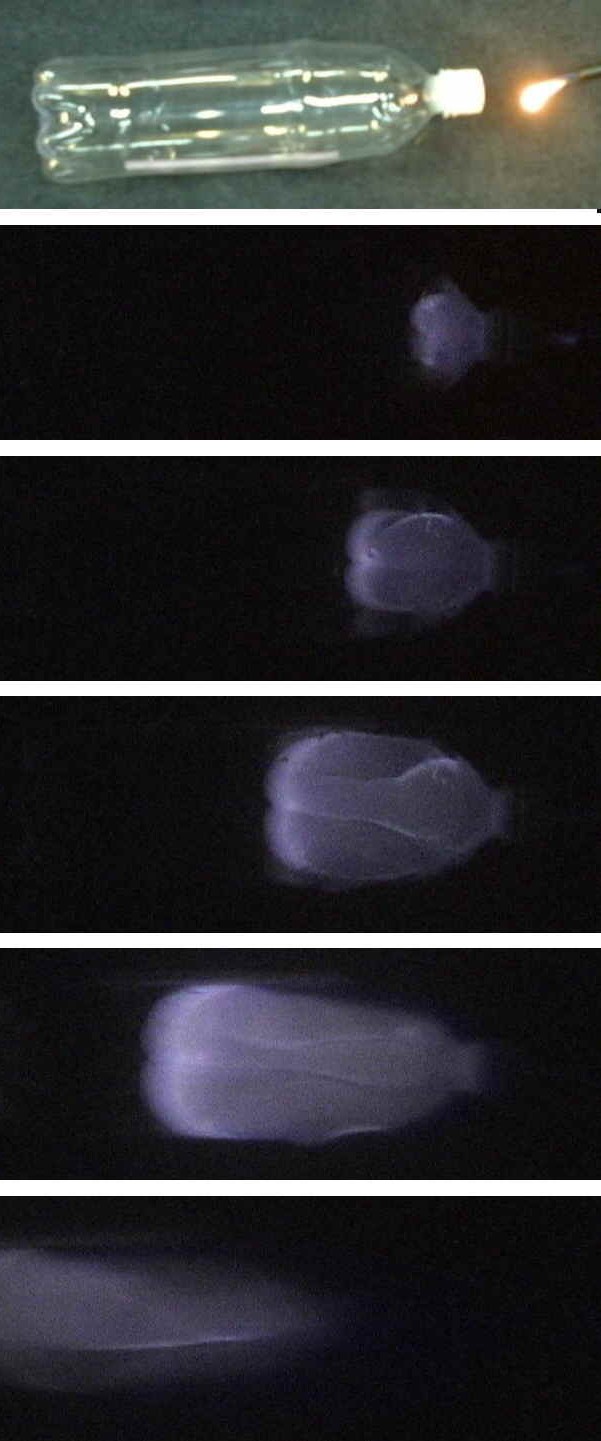 ペットボトルの中でウイスキーのアルコールを気化させて着火。爆発でペットボトルが飛びだすまでのコマ送り。